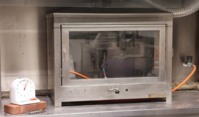 Heeft u gemerkt dat de brandende druppels het filterpapier in het dienblad onder het testmonster ontstoken hebben?