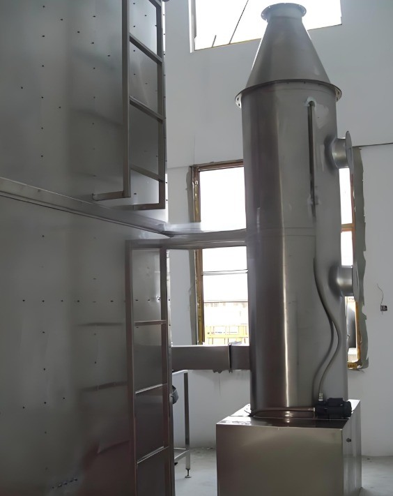 Smoke and dust removal tower: mainly used for experimental processes to produce smoke that meets environmental requirements after being treated by the smoke and dust removal tower. Material: The entire body of the washing tower is made of PP material, and there are no metal components in the system, which has extremely high acid and alkali resistance and corrosion resistance; Circulating liquid layer: It can be filled with tap water or washing solution, and the washing solution has a better effect. In order to prevent the waste discharged from corroding the bottom of the washing tower; Air layer: The exhaust gas emitted during production or experimental processes that needs to be treated, connected to the air layer and inlet for waste to enter the air layer; Filling layer: The filling material of the washing tower adopts sea urchin shaped mesoporous balls made of PP material, with a multi toothed TELLERTT shape. The surface of the filling layer has a window for easy cleaning of the balls inside the filling layer. The main function of the filling layer is to disperse the exhaust gas in the air layer into dispersed waste, so that the exhaust gas can be fully cleaned in the spray layer; Spray layer: The sprinkler head in the spray layer adopts a 120 degree rotating unobstructed nozzle, covering an area. The spray layer has an independent window for checking the working condition of the sprinkler head; Anti fog layer: It can effectively filter impurities in the air and prevent water mist crystals in the exhaust gas from corroding the inner wall of the washing tower; Circulating pump: The circulating pump circulates the liquid in the circulating liquid layer through the sprinkler head, saving water.